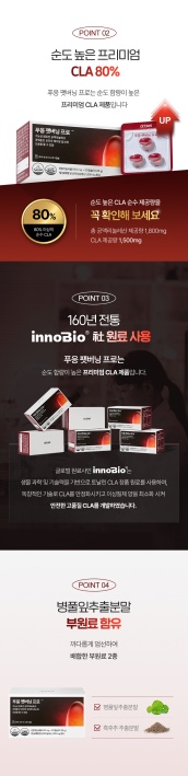 푸응 팻버닝 프로는 체지방 감소에 도움을 줄 수 있는 CLA(공액리놀레산) 성분을 중심으로 설계된 건강기능식품입니다. 특히 다이어트 CLA 1,500mg을 하루 기준으로 함유해 푸응 팻버닝 제품의 핵심 기능을 담당하고 있으며, 손도 높은 프리미엄 CLA 80% 함량으로 효능을 더욱 강화했습니다.