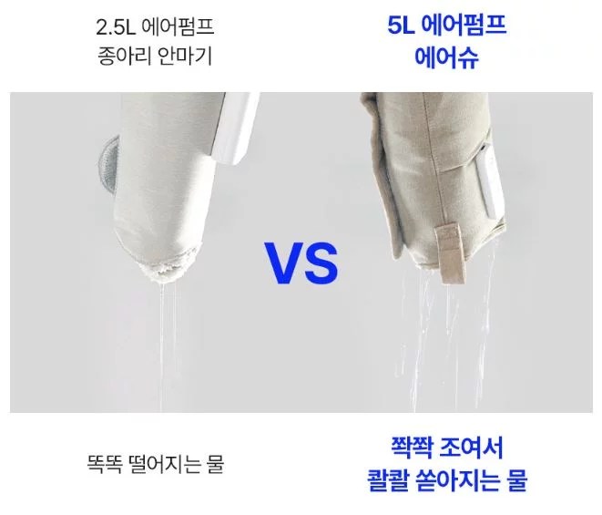 5L 에어펌프가 얼마나 강력한지 이해를 돕기 위해 그림을 첨부했는데요, 2.5L 에어펌프 수준에서는 물이 그냥떨어지는 정도로 짜지지만 5L에서는 2배 가량 강력해져 물이 훨씬 많이 쏟아져 나옵니다.