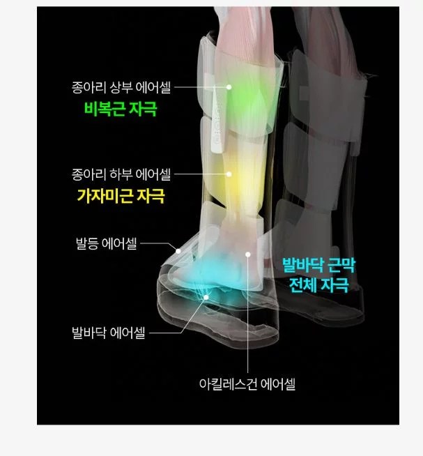 발바닥, 발등, 종아리, 발바닥등으로 에어셀을 여러개로 나눠 빠지는 부분없이 꼼꼼하게 효과적으로 마사지를 할 수 있도록 만들었습니다.