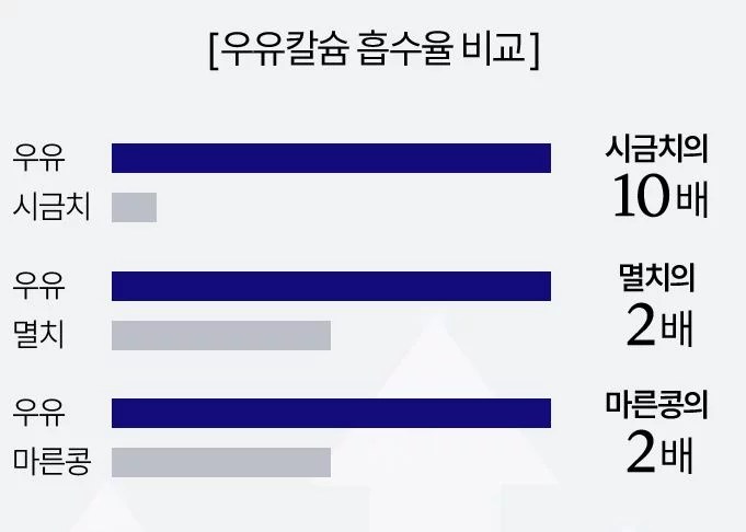 우유칼슘은 일반칼슘에 비해 체내 흡수력이 매우 높아서 그런 것이었는데요 아래 그림을 보시면 시금치의 10배, 멸치의 2배, 마른콩의 2배정도로 매우 높은 편이죠